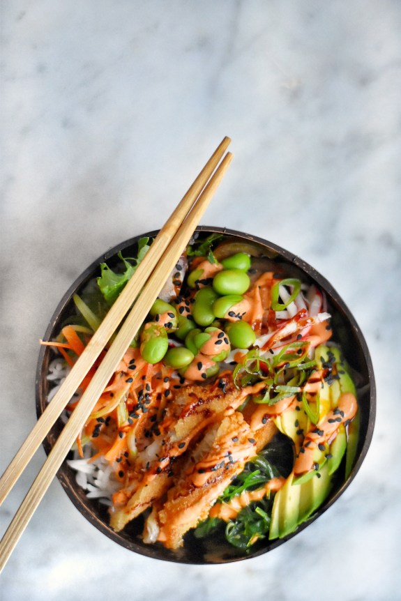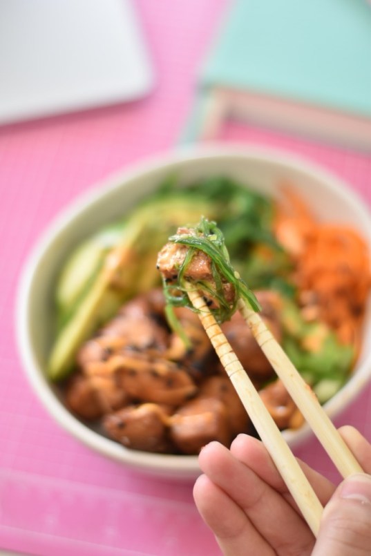 Arma el bowl: Agrega el arroz a un tazón profundo, cubre con las verduras (zanahoria/wakeame/soya/etc) agrega el salmón. Rocíe un poco de mayonesa de sriracha y salsa de anguila por encima. Termina semillas de sésamo y/o cebollín en rodajas finas. ¡A Disfrutar!