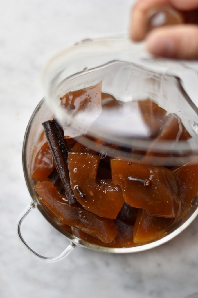Ahora, en una olla doble fondo grande vierte el agua, el azúcar, el papelón troceado, las astillas de canela, los clavos, el cardamomo y revuelve bien. Cocina por unos minutos a fuego bajo hasta formar un almíbar homogéneo.